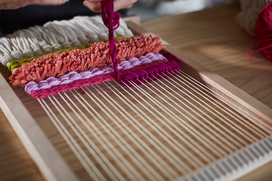 RYA knots can be added at the bottom of the weave before tabby weaving to create a tasselled fringe, or can also be used throughout the weave for a tufted carpet effect.